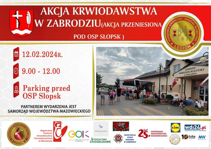 W poniedziałek 12 lutego od godziny 9.00 do 12.00 mobilny punkt poboru krwi Regionalnego Centrum Krwiodawstwa i Krwiolecznictwa w Warszawie będzie czekał na krwiodawców na parkingu przed OSP Słopsk.