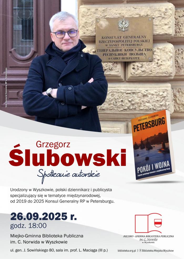 Miejsko-Gminna Biblioteka Publiczna im. C. Norwida w Wyszkowie zaprasza na spotkanie autorskie z Grzegorzem Ślubowskim – dziennikarzem, publicystą i dyplomatą, urodzonym w Wyszkowie.