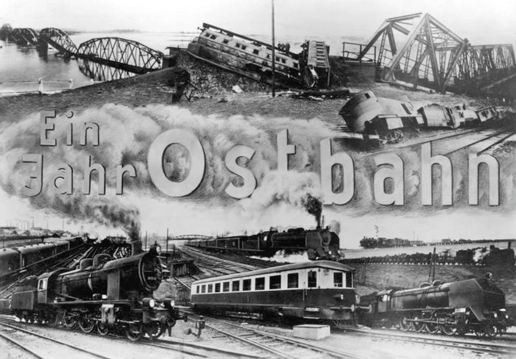 Propagandowy fotomontaż, przygotowany przez niemieckie Koleje Wschodnie Ostbahn, ukazujący zmiany na kolei w rok po jej przejęciu. Źródło: P. Łepkowski, Polscy kolejarze byli bohaterami w czasie II wojny światowej, „Rzeczpospolita”