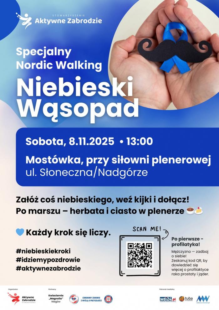W sobotę, 8 listopada, odbędzie się wyjątkowy marsz Nordic Walking pod hasłem „Niebieski Wąsopad 2025” – wydarzenie poświęcone profilaktyce zdrowia mężczyzn, szczególnie nowotworów prostaty i jąder. Akcję organizuje Stowarzyszenie Aktywne Zabrodzie, znane z promowania ruchu i zdrowego stylu życia w regionie.