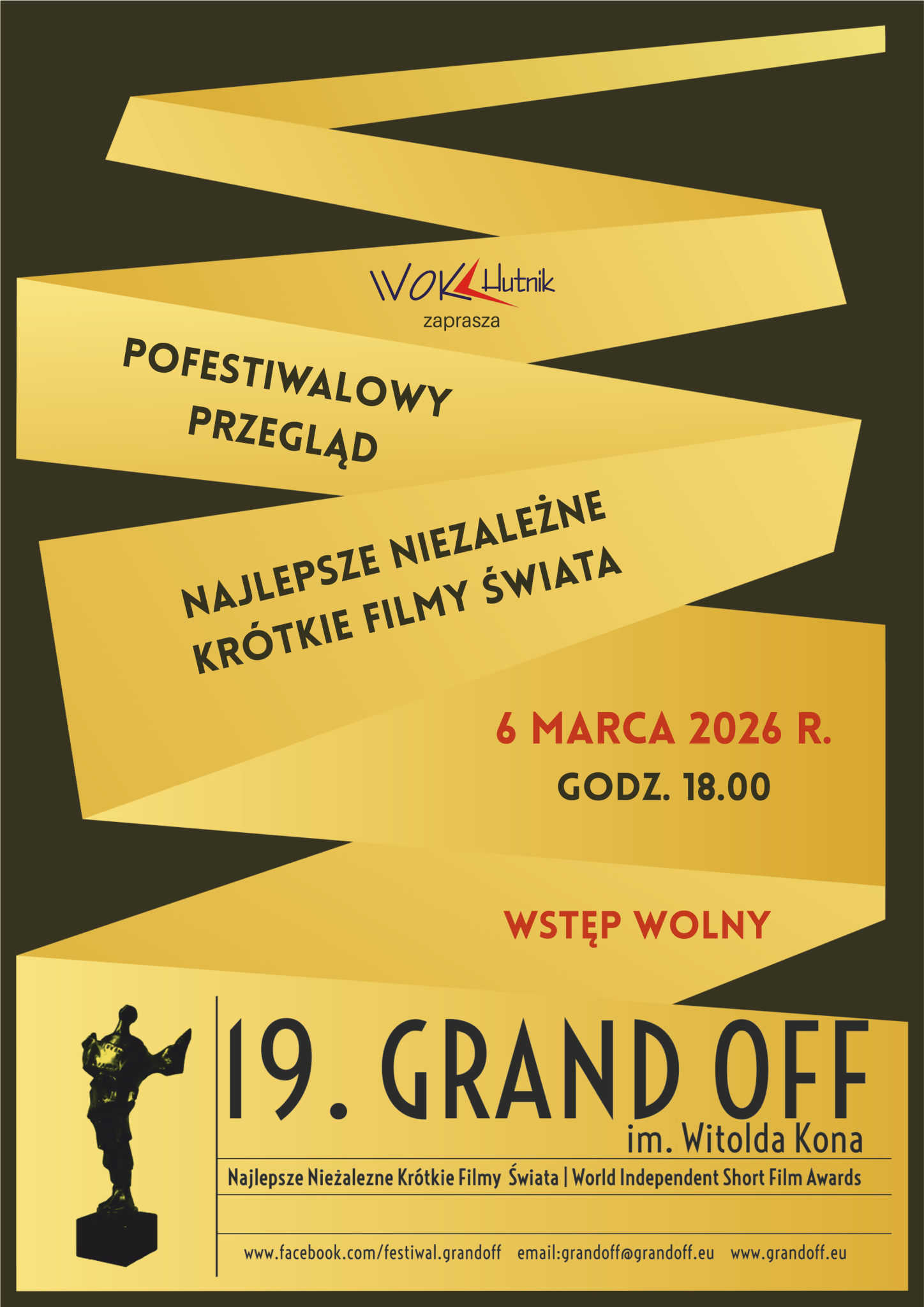 Wyszkowski Ośrodek Kultury "Hutnik" zaprasza na przegląd filmów nagrodzonych na festiwalu Grand Off im. Witolda Kona. To najlepsze niezależne krótkie filmy świata. Wstęp wolny.