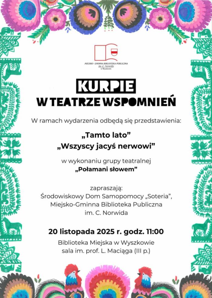 Kurpie w Teatrze Wspomnień już 20 listopada w Bibliotece Miejskiej w Wyszkowie. Tego dnia o godz. 11:00 w sali im. prof. L. Maciąga (III p.) odbędą się dwa spektakle grupy teatralnej „Połamani słowem”: „Tamto lato” oraz „Wszyscy jacyś nerwowi”. Wydarzenie organizują Środowiskowy Dom Samopomocy „Soteria” oraz Miejsko-Gminna Biblioteka Publiczna im. C. Norwida.
