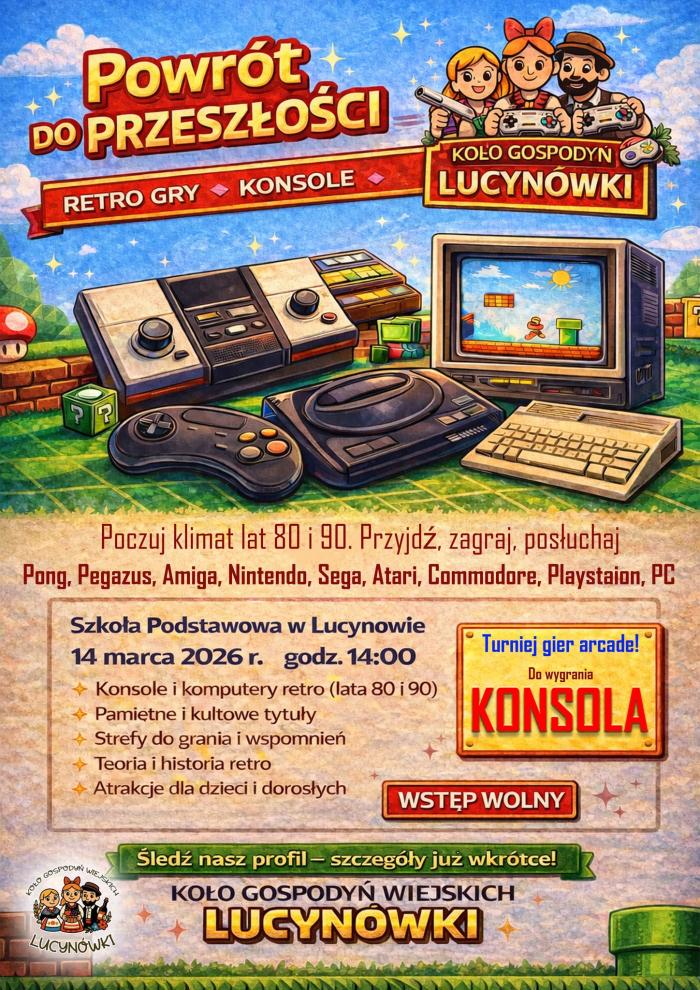 Koło Gospodyń Wiejskich "Lucynówki" zaprasza na wyjątkowe wydarzenie. W sobotę 14 marca 2026 roku w Szkole Podstawowej w Lucynowie odbędzie się spotkanie z kultowymi konsolami i komputerami z lat 80. i 90.